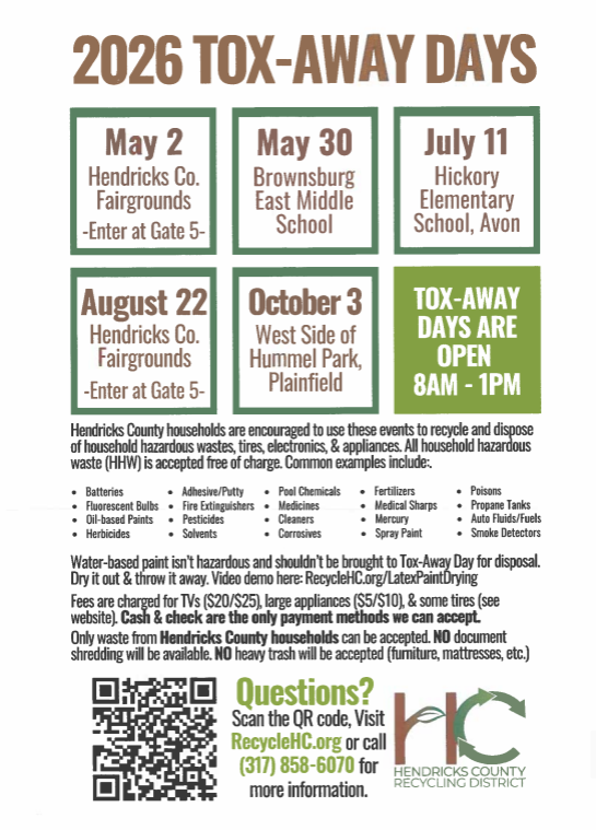 Restrictions: Only residents of Hendricks County are allowed to use the District’s Tox-Away Day events. Regulations prohibit hazardous wastes from other organizations (businesses, churches, schools, non-profits, etc.) from being accepted. Please contact us if you have questions about your eligibility to participate in a Tox-Away Day event.