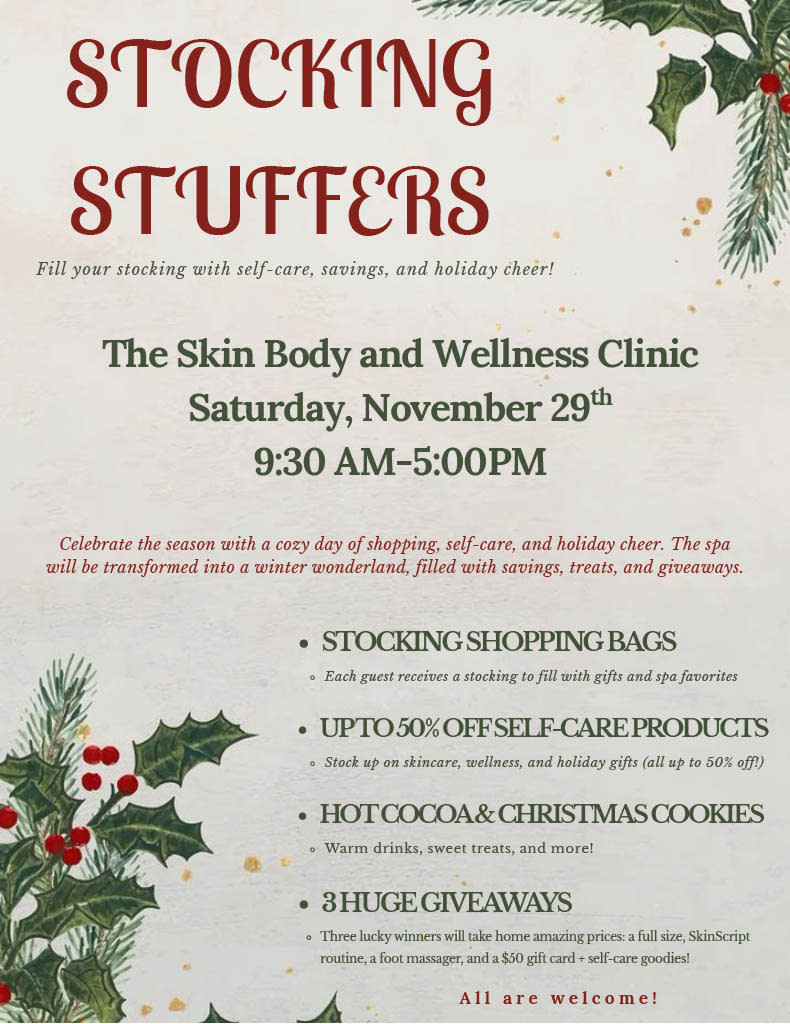 Celebrate the season with a cozy day of shopping, self-care, and holiday cheer. The spa will be transformed into a winter wonderland, filled with savings, treats, and giveaways.