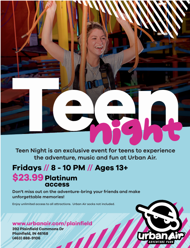 Teen Night is an exclusive event for teens to experience The adventure, music, and fun at Urban Air. Fridays // 8 - 10 PM // Ages 13+ Platinum access- $23.99 Don't miss out on the adventure-bring your friends and make unforgettable memories! Enjoy unlimited access to all attractions. Urban Air socks are not included.