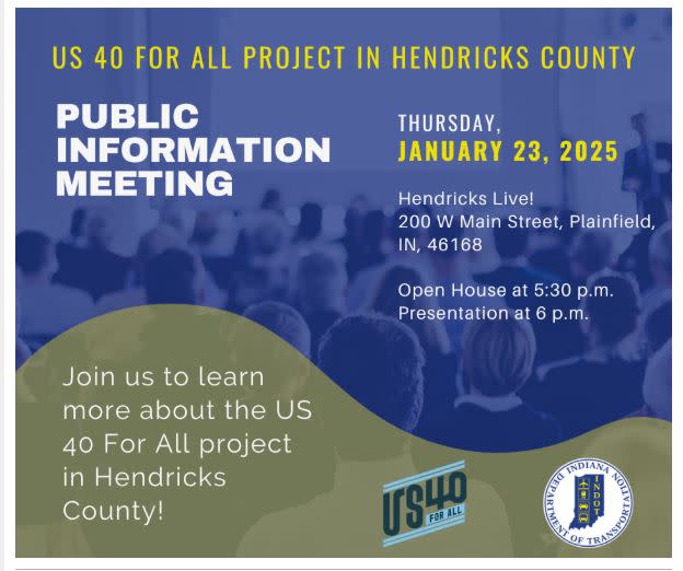 The Indiana Department of Transportation announces a public meeting to launch the US 40 For All project in Plainfield. INDOT invites members of the public to this meeting to learn more about the project and interact with the project team during an open house, happening prior to and following the formal presentation.